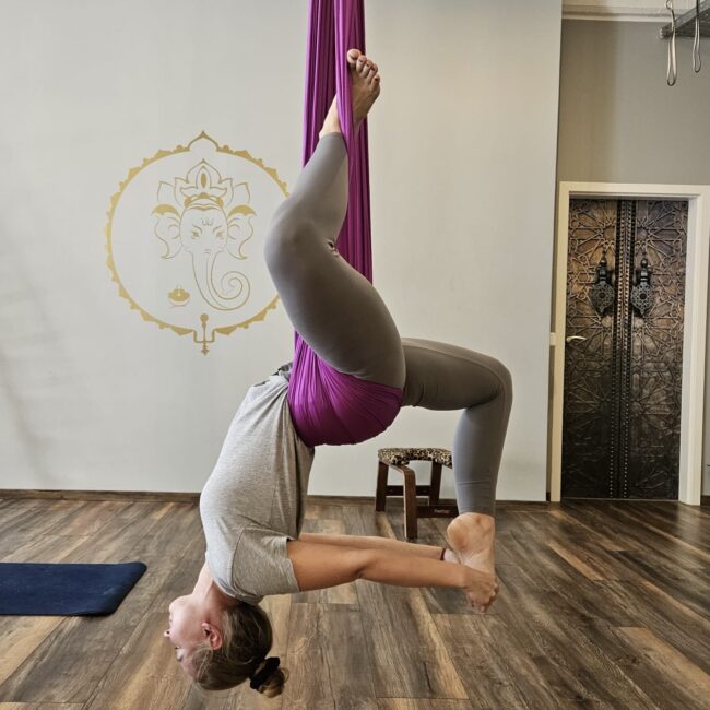 Umwickelt und gehalten von einem großen AERIAL YOGA Tuch hängst du buchstäblich in der Luft. Während du die Asanas (Yogahaltungen) einnimmst, spielst du mit der Schwerkraft, erfährst so ein Gefühl der Schwerelosigkeit und kannst dich mehrdimensional im Raum bewegen.