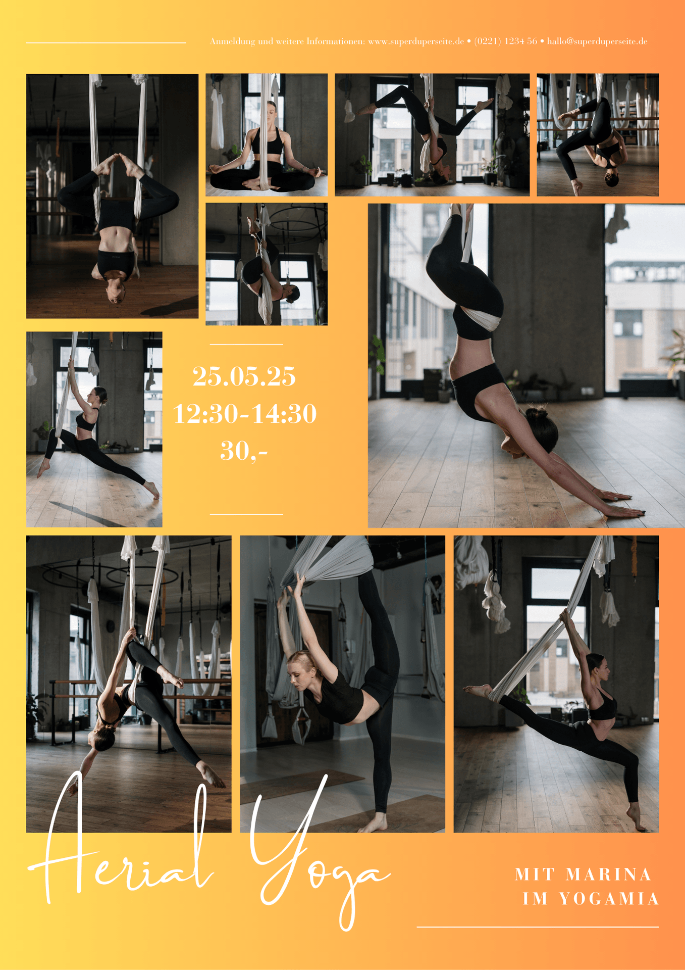 Umwickelt und gehalten von einem großen AERIAL YOGA Tuch hängst du buchstäblich in der Luft. Während du die Asanas (Yogahaltungen) einnimmst, spielst du mit der Schwerkraft, erfährst so ein Gefühl der Schwerelosigkeit und kannst dich mehrdimensional im Raum bewegen.